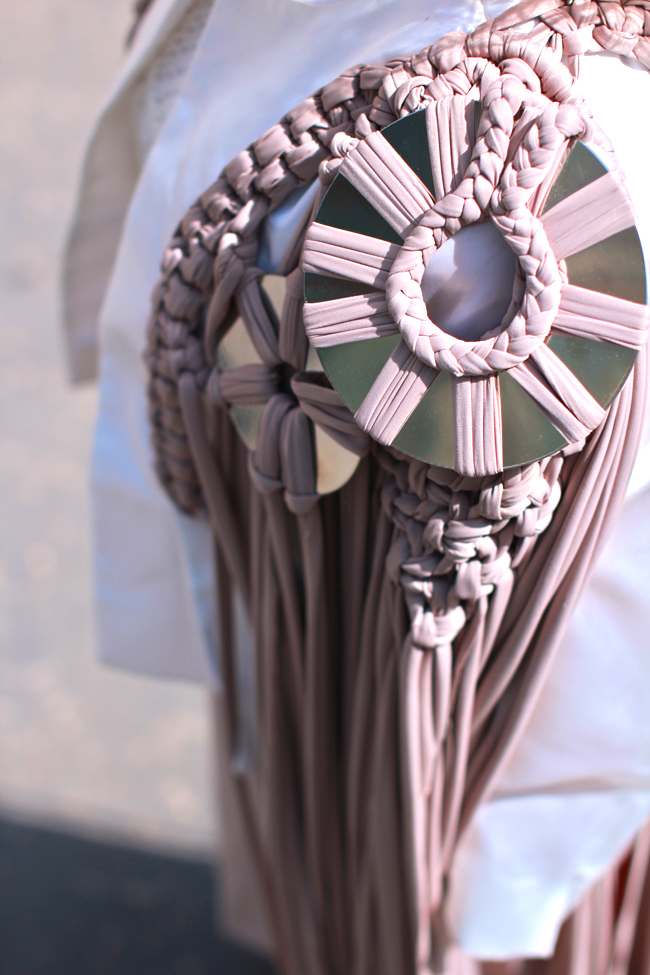 Craftsmanship from Vorarlberg meets Viennese elegance.Muses of Vorarlberg-born and in Vienna situated designer Maiken Domenica Kloser are theater and costumes. Fashion is a "total work of art" for her, consisting of high-quality and personally workmanship, finest materials like famous lace from Vorarlberg and unique design. And you can see this kind of approach in really every single piece of her label "Maiken K." Skilled master tailor and (costume) designer creates both her regular collections and tailor-made works in an unique and distinctive style. For example: My body consists of white soft leather and personally hand-knotted macramé inserts. You really have to check out her breathtaking and versatile collections on Maiken's website and convince yourself, that it is well worth to invest in Austrian craftsmanship! - What do you think about my today's, really extravagant look? Are you as enthusiastic as me?