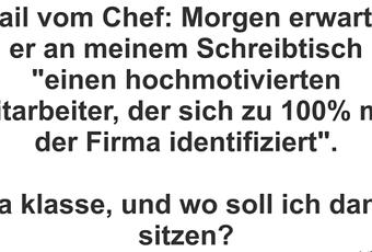 Auf Facebook teilen Vorige Folgende Mail vom Chef: Morgen erwartet er an meinem... Autor des Artikels : istdaslustig Zum Original-Artikel Mail vom Chef: Morgen erwartet er an meinem Schreibtisch "einen hochmotivierten Mitarbeiter, der sich zu 100% mit der Firma identifiziert". Na klasse, und wo soll ich dann sitzen? Hier geht es zum Artikel Mehr Lustiges auf www.istdaslustig.de Auf Facebook teilen Vorige Folgende Das könnte Ihnen gefallen Mehr