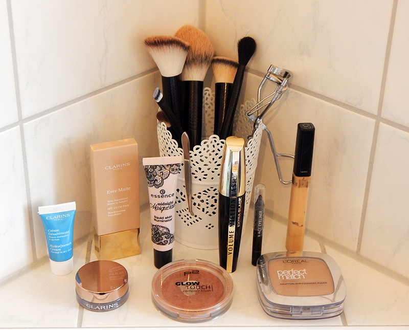 Zugegeben, der ganze Kram sieht irgendwie nach vielen Schritten aus.. aber so groß ist der Aufwand gar nicht :)Hier die Produkte, die ich verwendet habe:Clarins Feuchtigkeitstagescreme (Probe)Clarins Foundation Ever MatteL'Oréal Perfect Match PuderConcealer (ich glaube Manhattan, bin aber nicht sicher.Ich hab ihn schon so lange, dass jegliche Schrift schon abgegangen ist :D)L'Oréal Volume Million Lashes MascaraClarins Silver Ivory EyeshadowManhattan Kajal StiftP2 Glow Touch BlushEssence Midnight Masquerade HighlighterZum Schluss hab ich noch etwas transparenten Gloss auf die Lippen aufgetragen. Für diesen Look habe ich eine viertel Stunde gebraucht. Ich glaube, wie man die Produkte anwendet, muss ich euch nicht erklären, oder? :)