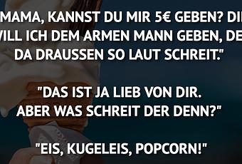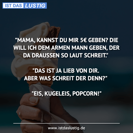 Auf Facebook teilen Vorige Folgende "MAMA, KANNST DU MIR 5€ GEBEN? DIE WILL ICH DEM... Autor des Artikels : istdaslustig Zum Original-Artikel "MAMA, KANNST DU MIR 5€ GEBEN? DIE WILL ICH DEM ARMEN MANN GEBEN, DER DA DRAUSSEN SO LAUT SCHREIT." "DAS IST JA LIEB VON DIR. ABER WAS SCHREIT DER DENN?" "EIS, KUGELEIS, POPCORN!" Hier geht es zum Artikel Mehr Lustiges auf www.istdaslustig.de Auf Facebook teilen Vorige Folgende Das könnte Ihnen gefallen Mehr