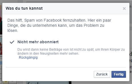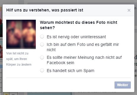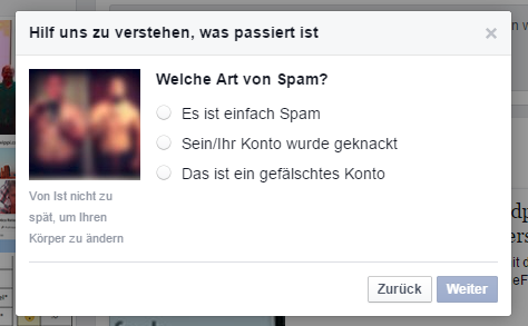 Schritt 4:Dann fragt Facebook noch einmal nach: "Es ist einfach Spam!""Weiter" klicken.(Manchmal hab ich den Verdacht, dass Facebook das extra so umständlich macht, damit sich eben nicht so viele beschweren ...)