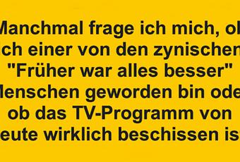 Auf Facebook teilen Vorige Folgende Manchmal frage ich mich, ob ich einer von den... Autor des Artikels : istdaslustig Zum Original-Artikel Manchmal frage ich mich, ob ich einer von den zynischen "Früher war alles besser" Menschen geworden bin oder ob das TV-Programm von heute wirklich beschissen ist. Hier geht es zum Artikel Mehr Lustiges auf www.istdaslustig.de Auf Facebook teilen Vorige Folgende Das könnte Ihnen gefallen Mehr