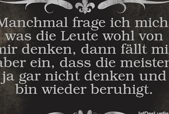 Auf Facebook teilen Vorige Folgende Manchmal frage ich mich, was die Leute wohl von... Autor des Artikels : istdaslustig Zum Original-Artikel Manchmal frage ich mich, was die Leute wohl von mir denken, dann fällt mir aber ein, dass die meisten ja gar nicht denken und bin wieder beruhigt. Hier geht es zum Artikel Mehr Lustiges auf www.istdaslustig.de Auf Facebook teilen Vorige Folgende Das könnte Ihnen gefallen Mehr