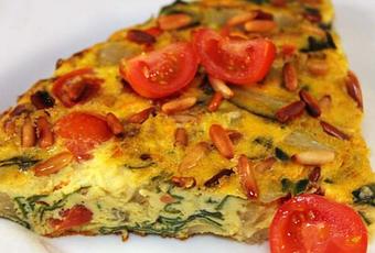 Die Mischung in die beschichtete Pfanne geben und 5 – 6 Minuten stocken lassen, bis die Mangold-Tomaten-Frittata teilweise fest ist. Die Pinienkerne in einer Pfanne ohne Öl goldgelb rösten. Anschließend auf ein Krepp geben.