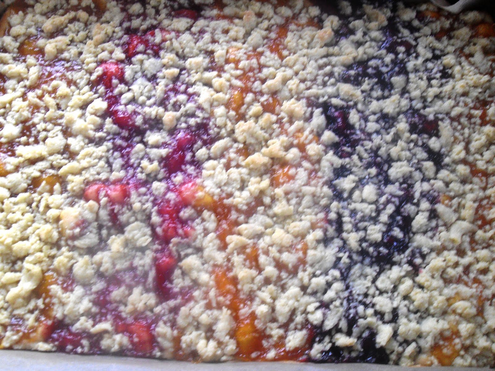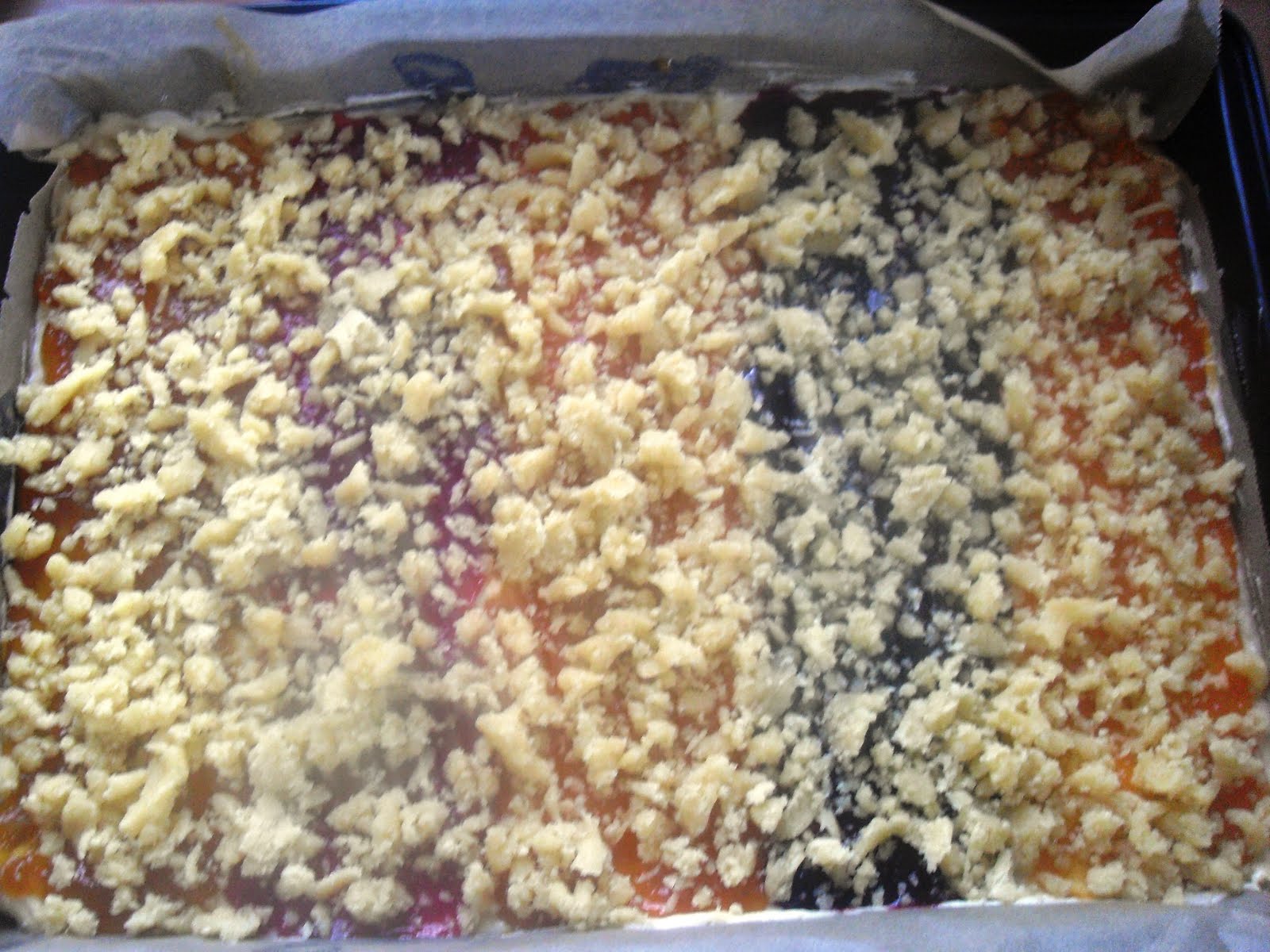 Jetzt die Marmelade vorsichtig und gleichmäßig auf dem Teig verstreichen. Ich habe unsere Reste aufgebraucht und die Marmeladensorten als Streifen verteilt.