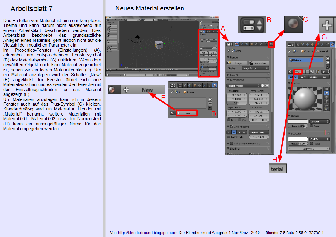 Es kann aber möglich sein, dass für die Lampe Schatten berechnet werden soll, dieser aber nicht alle Objekte beschatten soll. Die Lösung wäre dann, die Materialeigenschaften des Objektes so einzustellen, dass es keinen Schatten empfängt.In der Szene Abbildung 5A werfen die Figuren alle Schatten auf die Leisten, die sich hinter ihnen befinden. In der Abbildung 5B wurde das Material für die mittlere Leiste so eingestellt, dass es keinen Schatten empfängt.In dieser Szene macht eine solche Einstellung natürlich keinen Sinn, da der Schatten selbstverständlich über alle Leisten fallen muss. Sie soll uns nur als Beispiel dienen. Es ist zu beachten, das der Schatten der Figur links an der Wand in beiden Fällen durchläuft.Wie ein Material erstellt wird und wie einem Objekt ein Material zugewiesen wird, ist in den Arbeitsblättern 7 „Material erstellen“ und 3 „Einem Objekt in der Szene vorhandenes Material zuweisen“ beschrieben.Um nun einzustellen, dass ein Material keinen Schatten empfangen soll ist wie folgt vorzugehen.Im Properties-Fenster(Abb.5 C) erkennbar an dem entsprechenden Fenstersymbol (Abb.5 D) wird der Bereich für die Materialeinstellungen durch Klicken auf das entsprechende Symbol (Abb.5 E) gewählt. Im Bereich „Shadow“ (Abb.5 F) finden wir das Feld „Receive“ (empfangen) (Abb.5 G). Standardmäßig ist hier ein Häkchen gesetzt, damit das Material Schatten empfängt. Wir es entfernt, empfängt das Material keinerlei Schatten mehr (Abb.5 H).Hinweis! Selbstverständlich wirkt diese Einstellung für alle Objekte, die dieses Material tragen. Soll, wie in unserem Beispiel, ein einzelnes von mehreren Objekten mit gleichem Material keinen Schatten zeigen. So ist von dem Material für dieses Objekt eine Kopie anzulegen und dann nur für diese Materialkopie die Einstellung vorzunehmen.
