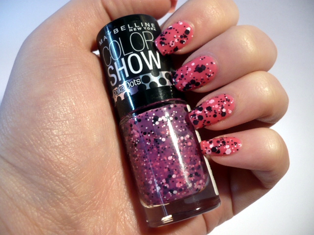 Hallo meine Lieben,heute möchte ich euch einen der drei Lacke vorstellen, die ihr oben bereits sehen könnt. Sicher haben bereits einige von dem Polka Dots Lacken gehört, die jetzt an der Maybelline Theke zu finden sind. Erhältlich sind vier dieser Lacke in den Farben 197 Chalk Dust, 198 Shooting Stars (Blau), 200 Rain Forest Canopy (Grün) & 201 Speckled Pink (Pink). Chalk Dust habe ich nicht mitgenommen, weil er im Fläschchen sehr viel Ähnlichkeit mit dem Confetti Lack von L'oreal hat, da ich aber bereits ein paar Vergleiche gesehen habe, bin ich doch noch am überlegen, mir den doch noch zu holen.Heute soll es aber erst einmal um um 201 Speckled Pink.In den Lack hatte ich mich als erstes verliebt, als ich die ersten Bilder sah und auch diesen Lack hatte ich als erstes in den Fingern, als ich diese am Montag im DM entdeckte. Da ich kein Geld mit hatte (Eigentlich die beste Idee, wenn ich den DM betrete), bin ich direkt mit den Lacken in meiner Hand zu meiner Mutter gerannt und habe beteuert, wie schön diese Lacke doch sind. Und wie ihr sehen könnt, bin ich damit durchgekommen, denn auch meine Mutter verliebte sich in die Lacke und räumte sie sofort ins Körbchen.Ich habe direkt damit gerechnet, dass diese Lacke doch sehr durchsichtig sind und als ich das Fläschchen öffnete und mir den Pinsel anschaute, war alles klar und ich entschied, eine deckende Base aufzutragen. :)Entschieden habe ich mich für einen Flormar Supershine Lack, von dem ich zwei Schichten aufgetragen habe.Ja, der Lack ist nicht sonderlich deckend und ich wollte eigentlich einen Lack nehmen, der wesentlich weniger pinkstichig ist. Da ich das Bild gestern Abend gemacht habe, als ich meine Nägel lackiert habe, konnte ich den richtigen Pinkstich nicht einfangen. Benutzt habe ich die Nummer 33. Ich mag die Flormar Lacke sehr gerne und wenn man diesen auf einer weißen Base aufträgt, wird er sicherlich deckender und die Farbe kommt viel intensiver raus als so.Doch für den Polka Dots Lack reichte mir dieses Ergebnis vollkommen. :)Denn zwei Schichten von Speckled Pink und das Ergebnis war vollkommen deckend. Auch die Menge an schwarzen und weißen Partikeln reichte mir bei zwei Schichten vollkommen auf. Da kann man mit einer deckenden Base variieren, wie man will. :) Da der Lack nicht deckend ist, kann man mit der rosanen/pinken Base ziemlich variieren. Die Basis des Lackes ist doch weniger pinkstichig, weshalb ich eigentlich auch einen rosanen Lack im Auge gehabt hatte, aber dieses Ergebnis mag ich doch wirklich sehr gerne.Normal hasse ich Pink wirklich, ich ziehe keine pinken Klamotten an und sonst mag ich Pink auch überhaupt nicht, aber wenn es um meine Nägel geht, kann ich wirklich jede Farbe auftragen. :)Ich finde diese Lacke auf jeden Fall toll, weil sie wieder frischen Wind in die Theken der Drogerie bringen und bei dem Preis kann man echt nichts falsch machen. Bisher habe ich überall gelesen, dass man die Lacke bei einer Menge von 7 ml für 2,25 Euro bekommt, ich habe am Montag jedoch 1,95 Euro bezahlt. Auch habe ich gelesen, dass es die Lacke erst seit gestern in den Läden gibt. War es vielleicht ein kleiner Fehler der DM Filiale, in der ich war? Ich weiß es nicht, aber auf jeden Fall habe ich da doch ein kleines Schnäppchen geschlagen. :) Und auch für 2,25 Euro hätte ich sie mitgenommen, denn ... ich dachte, dass diese Lacke 2,25 Euro kosten und habe erst später auf dem Bon gesehen, dass ich beziehungsweise meine Mutter 1,95 Euro für die Lacke bezahlt hat. :D Ich bin auf jeden Fall gut weggekommen und habe drei wunderschöne neue Lacke ...Wie findet ihr die Lacke?Habt ihr die Lacke vielleicht schon gesichtet?