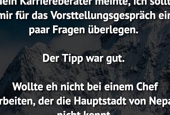 Auf Facebook teilen Vorige Folgende Mein Karriereberater meinte, ich sollte mir für... Autor des Artikels : istdaslustig Zum Original-Artikel Mein Karriereberater meinte, ich sollte mir für das Vorsttellungsgespräch ein paar Fragen überlegen. Der Tipp war gut. Wollte eh nicht bei einem Chef arbeiten, der die Hauptstadt von Nepal nicht kennt. Hier geht es zum Artikel Mehr Lustiges auf www.istdaslustig.de Auf Facebook teilen Vorige Folgende Das könnte Ihnen gefallen Mehr