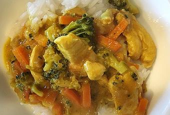 Unser Lieblingscurry mit Brokkoli, Möhren, Hähnchen und etwas Erdnussbutter