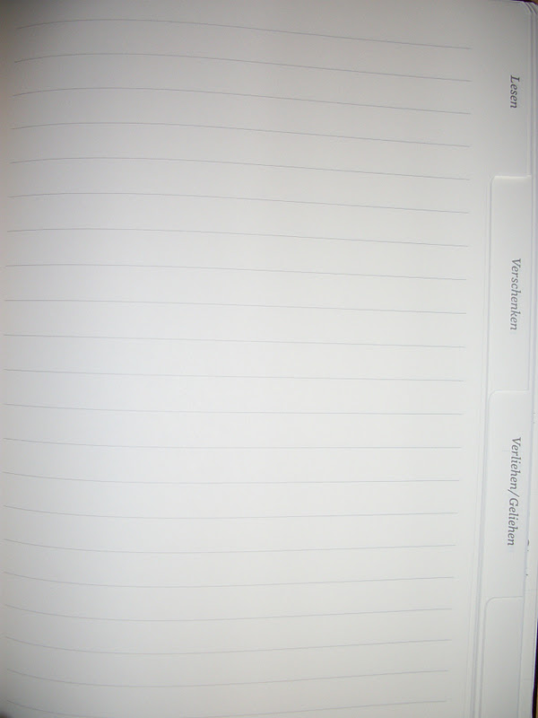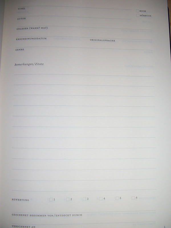 Im EX LIBRIS Lesejournal gibt es für jedes gelesene Buch eine Seite. Auf 252 Seiten im A5-Format ist Platz für genau 156 gelesene Bücher. Bei meinem Bücherverschleiß (2011 hab ich ja 211 Bücher verschlungen) werde ich wahrscheinlich kein Jahr auskommen, aber ich lasse mich überraschen...