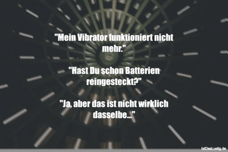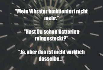 Auf Facebook teilen Vorige Folgende "Mein Vibrator funktioniert nicht mehr." "Hast... Autor des Artikels : istdaslustig Zum Original-Artikel "Mein Vibrator funktioniert nicht mehr." "Hast Du schon Batterien reingesteckt?" "Ja, aber das ist nicht wirklich dasselbe..." Hier geht es zum Artikel Mehr Lustiges auf www.istdaslustig.de Auf Facebook teilen Vorige Folgende Das könnte Ihnen gefallen Mehr