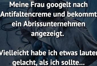 Auf Facebook teilen Vorige Folgende Meine Frau googelt nach Antifaltencreme und... Autor des Artikels : istdaslustig Zum Original-Artikel Meine Frau googelt nach Antifaltencreme und bekommt ein Abrissunternehmen angezeigt. Vielleicht habe ich etwas lauter gelacht, als ich sollte... Hier geht es zum Artikel Mehr Lustiges auf www.istdaslustig.de Auf Facebook teilen Vorige Folgende Das könnte Ihnen gefallen Mehr