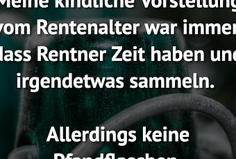Auf Facebook teilen Vorige Folgende Meine kindliche Vorstellung vom Rentenalter war... Autor des Artikels : istdaslustig Zum Original-Artikel Meine kindliche Vorstellung vom Rentenalter war immer, dass Rentner Zeit haben und irgendetwas sammeln. Allerdings keine Pfandflaschen. Hier geht es zum Artikel Mehr Lustiges auf www.istdaslustig.de Auf Facebook teilen Vorige Folgende Das könnte Ihnen gefallen Mehr