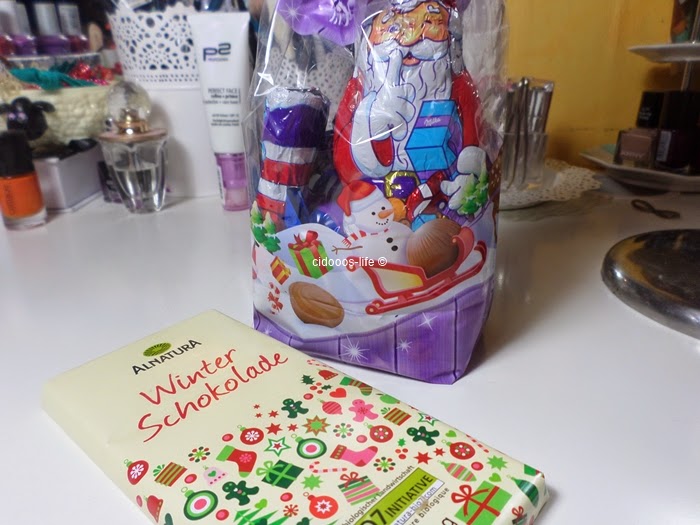 Süßes! Die Schokolade gab es auch von Lisa, da ist Spekulatius drinne! Die Kekse die sie gebacken hat, sind schon alle :D Den Weihnachtsmann und co gab es von Jey, da ich gestern bei ihr Dogsitting war :)