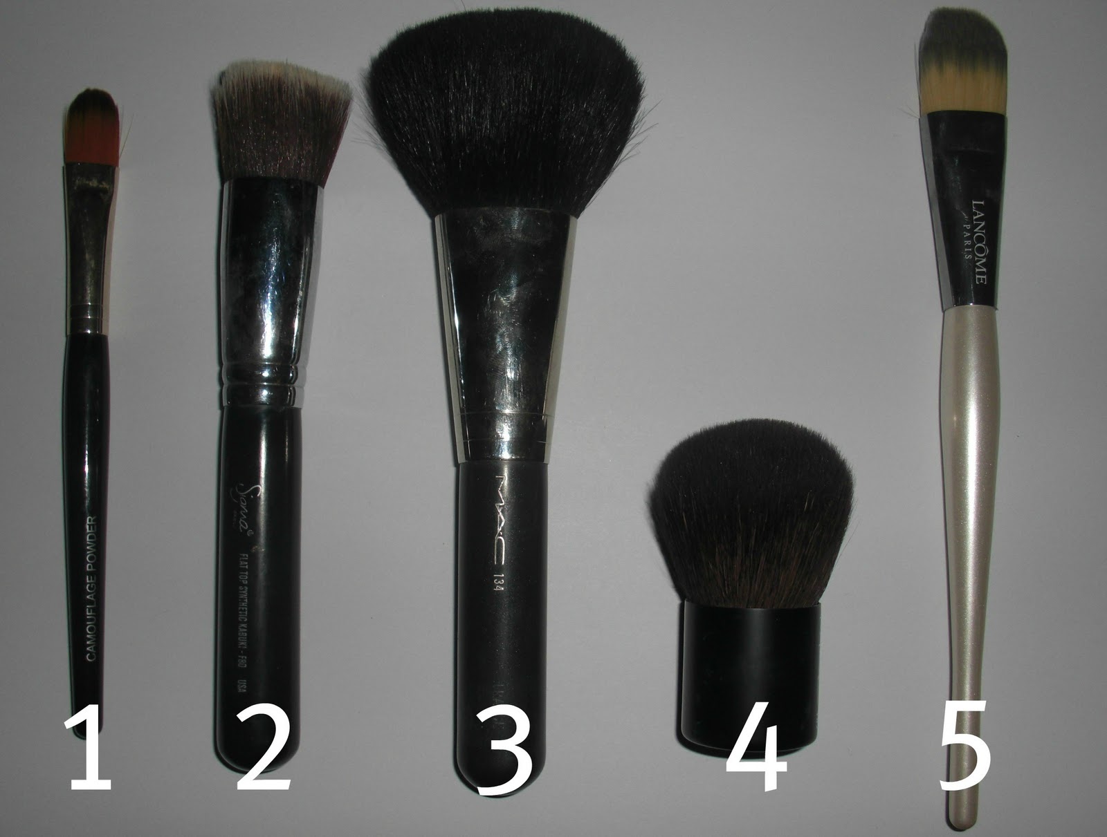 1: Laura Mercier Camouflage Powder: Ich verwende Ihn um meine minimalen Augenschatten zu überdecken. 2: Sigma Flat Top Synthetic Kabuki - F80: Wie ich finde der beste Pinsel für Flussigfoundation. Ich hatte viele Rewievs dazu gelesen und gesehen und habe ihn letztendlich auch gekauft und bin absolut begeistert. Perfekte Verblendung und Einarbeitung in die Haut dank der weichen eng gebundenen Synthetikhaare.3: MAC 134: Mein Puderpinsel. Gross und mittelfest gebunden. Ideal für loses und gepresstes Puder zum abpudern.4: MAC 182: Der perfekte Pinsel für Mineralpuder, da locker aber dicht gebunden.5: Lancome Foundation Brush: Der klassische Foundationpinsel. Ab und an greif ich doch ganz gerne auf ihn zurück.