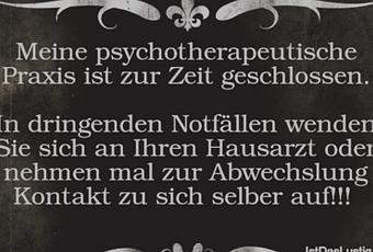 Auf Facebook teilen Vorige Folgende Meine psychotherapeutische Praxis ist zur Zeit... Autor des Artikels : istdaslustig Zum Original-Artikel Meine psychotherapeutische Praxis ist zur Zeit geschlossen. In dringenden Notfällen wenden Sie sich an Ihren Hausarzt oder nehmen mal zur Abwechslung Kontakt zu sich selber auf!!! Hier geht es zum Artikel Mehr Lustiges auf www.istdaslustig.de Auf Facebook teilen Vorige Folgende Das könnte Ihnen gefallen Mehr