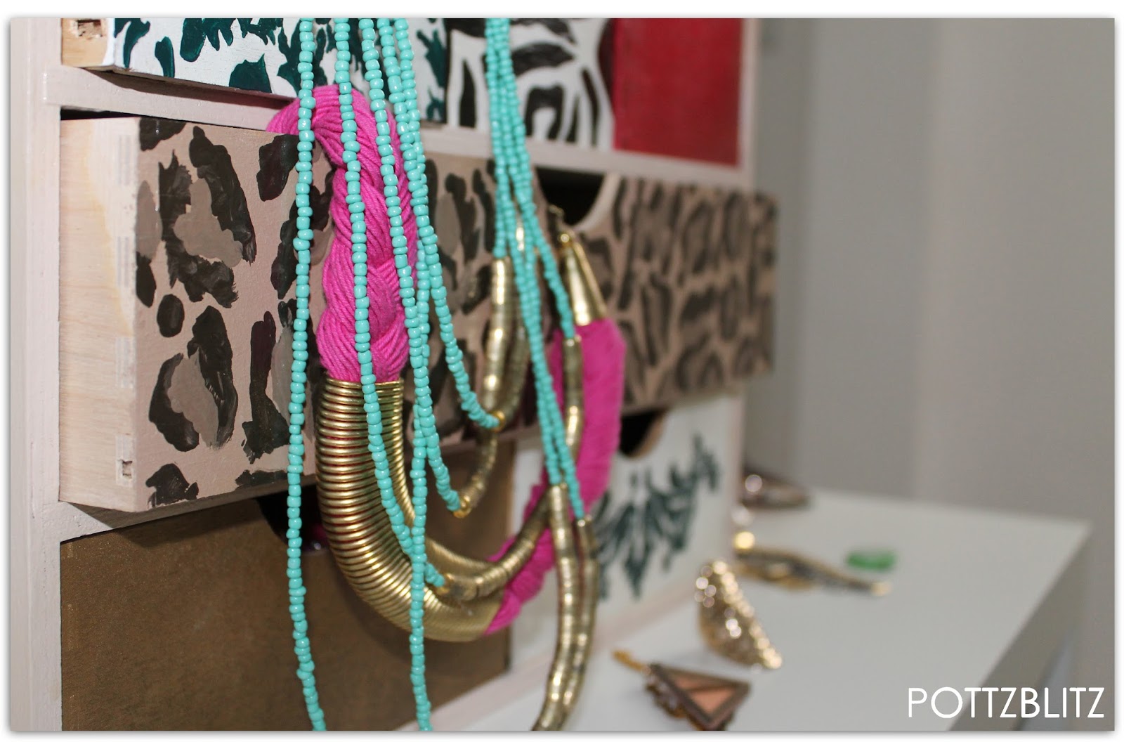 Zum Verschönern der Schubladen habe wir uns Abtön- und Sprühfarbe in den Couleurs unserer Wahl besorgt und uns einige Muster aus dem Internet gemopst (Muster Barock & animal print). Die schönsten Muster haben wir nun in passender Größe ausgedruckt und mit Hilfe von Pauspapier und Stift auf die Schubladen aufgezeichnet. Unser Tipp, streicht die Fläche mit dem Grundton des Musters zunächst einmal vor und zeichnet dann die feineren Elemente auf die getrocknete Fläche. Zwei Schubladen haben wir unifarben gestrichen, um das Schränkchen nicht zu überladen. Nun haben wir alles gut trocknen lassen und fertig! Die Schublade hat die perfekte Größe, um unsere Ringe und Ketten zu organisieren. Und das Tollste: Sollte das Fassungsvermögen nicht ausreichen, kauft ihr einfach eine weitere Kommode ein, streicht sie ähnlich an und schraubt die beiden Schränke zusammen.