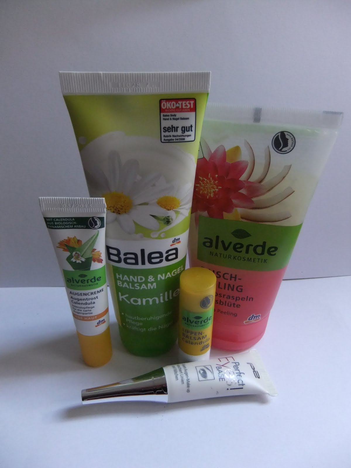 1. Balea Hand & Nagel Balsam Kamille für 0,85 €2. Alverde Lippenbalsam Calendula für ca.1,15 € 3.Alverde Augencreme Augentrost Calendula für ca. 3€4. P2 Perfect Eyes! Base für 2,99€ 5.Alverde Duschpeeling Kokosraspeln Lotusblüte für 1,95€