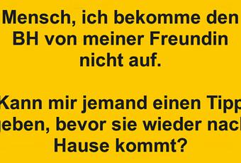 Auf Facebook teilen Vorige Folgende Mensch, ich bekomme den BH von meiner Freundin... Autor des Artikels : istdaslustig Zum Original-Artikel Mensch, ich bekomme den BH von meiner Freundin nicht auf. Kann mir jemand einen Tipp geben, bevor sie wieder nach Hause kommt? Hier geht es zum Artikel Mehr Lustiges auf www.istdaslustig.de Auf Facebook teilen Vorige Folgende Das könnte Ihnen gefallen Mehr