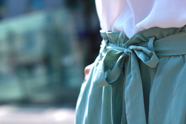Nachdem meine beiden ersten Looks diese Woche ein wenig extravaganter bzw. casual waren, habe ich heute ein klassisches & zeitloses Outfit für Euch. Auch sehr wenige Zutaten wie softe Sommerfarben, kaum Schmuck, aber dafür raffinierte Schnitte können einem Outfit das gewisse Etwas geben. An meinem neuen Midirock mag ich daher nicht nur die Farbe, sondern vor allem die geraffte Taille mit Schnürung, an der Bluse die kastigen Schulterabschlüsse. - Wie findet ihr meinen heutigen Look, der für mich sowohl fürs Büro, als auch einen after work drink funktioniert?Midi skirt & maximum effect.After presenting quite extravagant & casual looks, now it's the time for a classy & timeless outfit. In my opinion only a few ingredients like soft summer colors, less jewelry, but rather refined cuts can turn a look into a very special one. Therefore I'm in love both with the color and ruffled waist with lacing of my new midi skirt. And also with the boxy shoulders of my blouse. - What do you think about my OOTD, I'm both wearing at the office and or an after work drink?