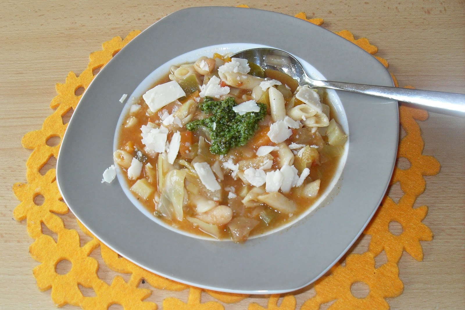 Bohnen in die Suppe geben (falls verwendet jetzt auch das Blattgemüse) und die Nudeln und erneut kochen lassen, bis die Nudeln weich sind.