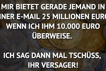 Auf Facebook teilen Vorige Folgende MIR BIETET GERADE JEMAND IN EINER E-MAIL 25... Autor des Artikels : istdaslustig Zum Original-Artikel MIR BIETET GERADE JEMAND IN EINER E-MAIL 25 MILLIONEN EURO, WENN ICH IHM 10.000 EURO ÜBERWEISE. ICH SAG DANN MAL TSCHÜSS, IHR VERSAGER! Hier geht es zum Artikel Mehr Lustiges auf www.istdaslustig.de Auf Facebook teilen Vorige Folgende Das könnte Ihnen gefallen Mehr