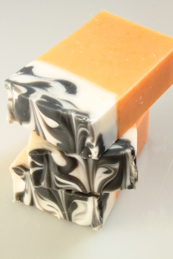 Die Zweite in der Art. Nur habe ich die Hochform benützt. Ich finde, der s/w Spoon-Swirl würde zu jeder Farbe gut passen. Diesmal habe ich Paprikapulver und ein wenig Pigment Blütenorange genommen. Das Paprikapulver löst sich sehr gut in Wasser, allerdings habe ich es noch mal durch das Sieb laufen lassen. Wenn noch Punkte in der Seife vorhanden sind, die verschwinden mit der Zeit von selber.