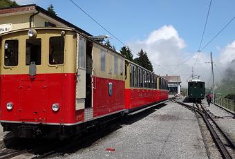 Jeder Zug besteht immer aus zwei Personenwagen und einer Lokomotive. Einer antiken Zahnrad-Lok, bei der ausschliesslich die beiden Zahnräder angetrieben werden. Deshalb braucht es auch im Ebenen eine Zahnstange. Aber eben ist es eh bloss in den drei Bahnhöfen.
