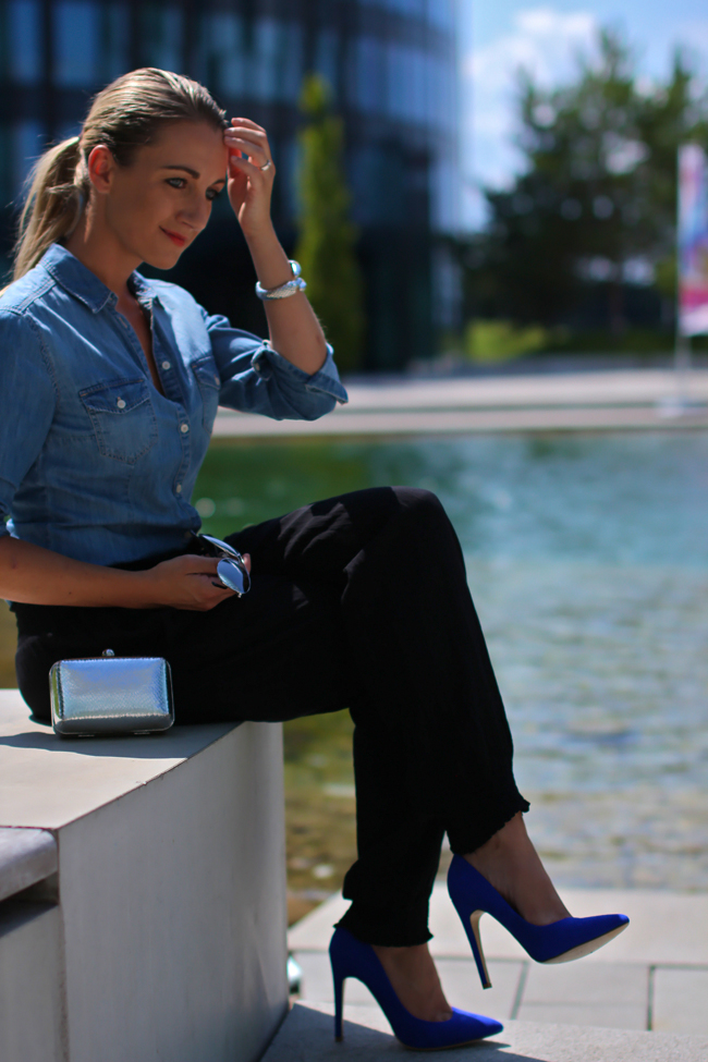 In my "material mix collection's" last outfit I've felt like modern Aladdin during our shooting, due to my wide & light Jodhpur pants and heavy wind :-) ... My darling's laughing at me and his question "How many wishes do I have now?" did the rest ... Nevertheless I've felt particularly well in this look cause it's both so comfy & relaxed and a bit classy due to my heels. - What do you think about my OOTD with jeans blouse, cotton-silk-pants and pumps?