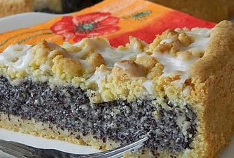 Die Mohnpuddingmasse in die Tortenform gießen und den restlichen Teig darauf “verkrümeln”
