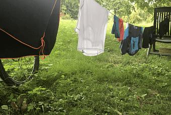 Wie jeden Abend hieß es also wieder, Tarp raus, Heringe rein und fertig ist das Nachtlager. Die ausgewaschenen Radklamotten mussten dieses Mal auf dem Rad trocknen...ganz trocken waren sie morgens aber irgendwie nie. Es gibt definitiv angenehmeres als in noch leicht feuchte Klamotten zu steigen. Aber auch das gehört wohl einfach dazu.