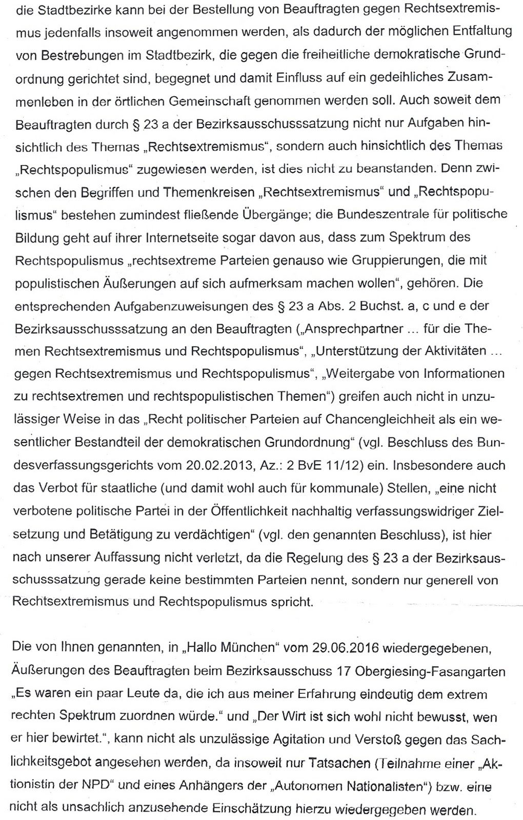 Zitat: “Ein Bezug zur örtlichen Gemeinschaft im Hinblick auf die Stadtbezirke kann bei der Bestellung von Beauftragten gegen Rechtsextremismus jedenfalls insoweit angenommen werden, als dadurch der möglichen Entfaltung von Bestrebungen im Stadtbezirk, die gegen die freiheitliche demokratische Grundordnung gerichtet sind, begegnet und damit Einfluss auf ein gedeihliches Zusammenleben in der örtlichen Gemeinschaft genommen werden soll.”Wenn der Satz richtig ist, dass eine Kommune “Bestrebungen ... [begegnen darf], die gegen die freiheitliche demokratische Grundordnung gerichtet sind”, dann ist der Gemeinde damit aber zugleich auch eine Grenze gesetzt: Parteipolitischen Bestrebungen, die NICHT gegen die FDGO gerichtet sind, darf ein staatliches Organ eben NICHT entgegentreten; vielmehr ist der Staat jenseits dieser (engen) Grenze zu parteipolitischer Neutralität verpflichtet. Und dass die politische Tätigkeit der AfD gegen die FDGO gerichtet wäre, wird die Regierung von OBB (und sogar die Stadt München) sicherlich nicht behaupten wollen.