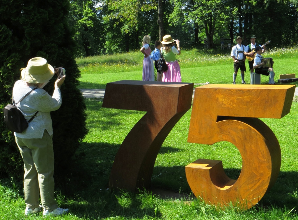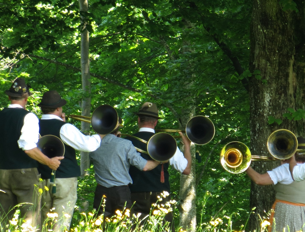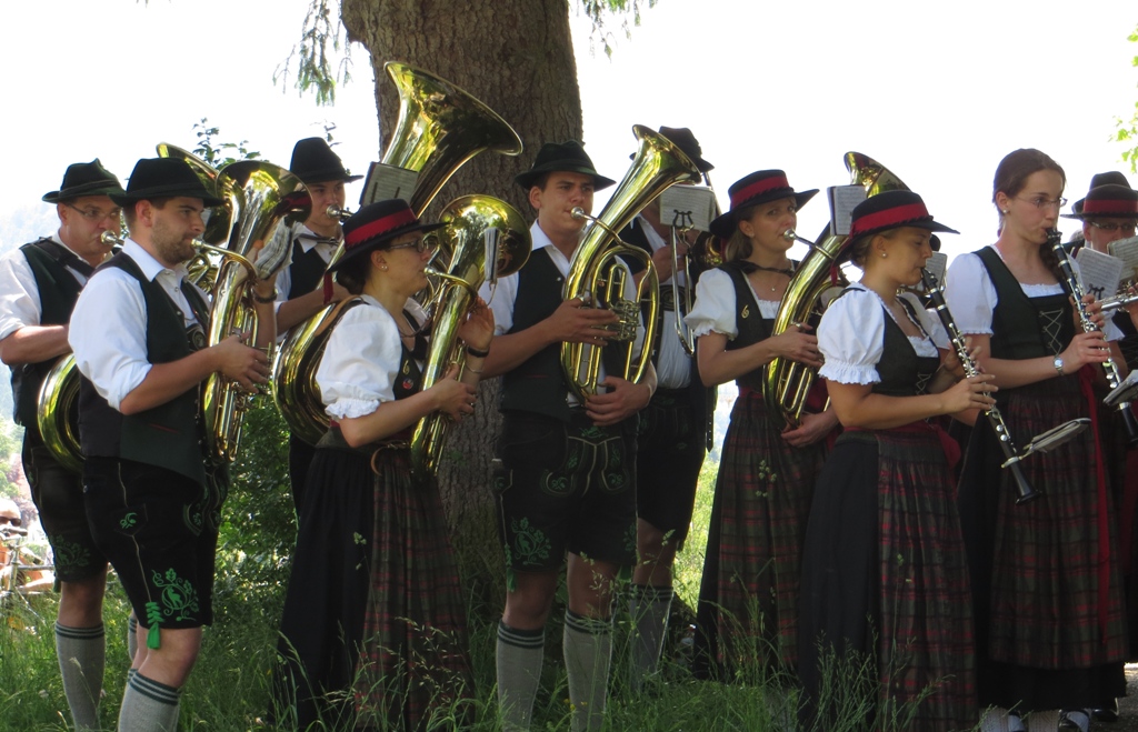 An einem Denkmal der sudetendeutschen Landsmannschaft für die Gefallenen beider Weltkriege und für die bei den Vertreibungen umgekommenen Personen stellt sich die Musikkapelle Schwangau auf (die wir, freilich nicht in Trachten gekleidet, vom Neujahranblasen kennen):