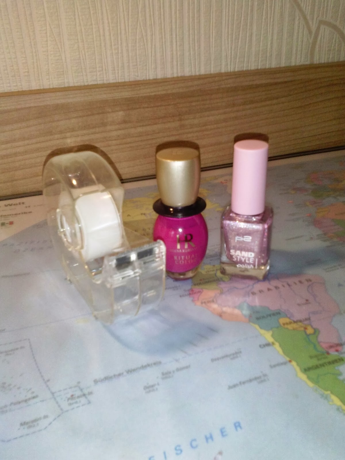 Normalen Klebe-/Tesafilm, einen pinken Nagellack und einen Nagellack aus der p2 Sand Polish Edition