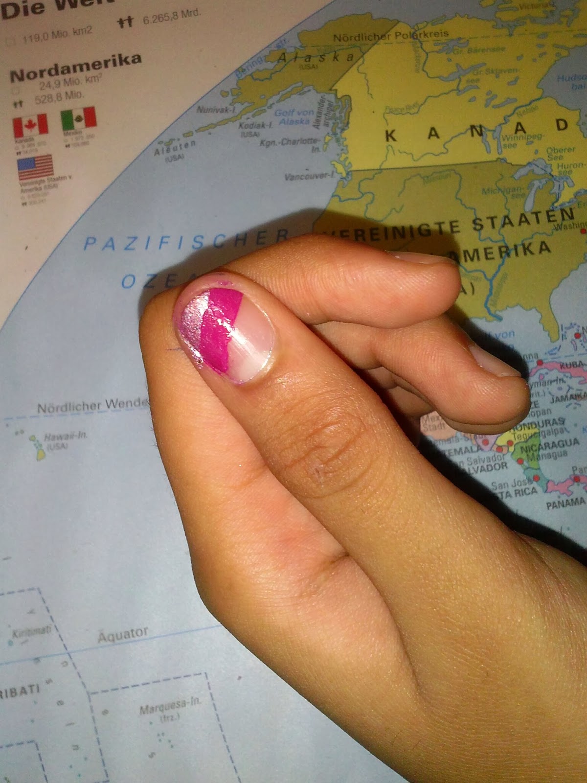 Anschließend lackierst du den Nagel mit dem normalen pinken Nagellack, es ist nicht schlimm wenn etwas daneben gehen sollte wenn es auf dem Rest deines Fingers ist lässt es sich nachher problemlos mit einem Wattestäbchen und Nagellackentferner entfernen, sollte etwas auf den Klebestreifen kommen ist dieses auch kein Problem da dieser am Ende sowieso wieder abgezogen wird. Bevor du allerdings den nächsten Schritt machst sorge dafür das alles gut getrocknet ist (Tipp: in der Zeit kannst du das ja alles auch für die anderen Nägel machen).
