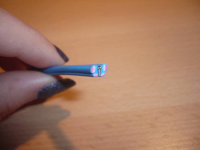 - hauchdünne Scheibchen von der Fimo Stange abschneiden und mit Topcoat oder Nagelkleber auf den Nagel kleben.