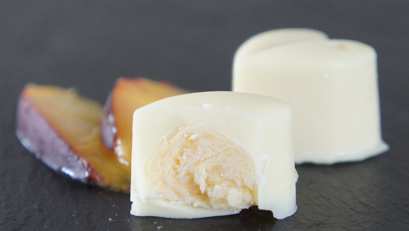 Die Schokolade vorsichtig schmelzen, darauf achten, dass die Schokolade nicht zu warm wird. Danach die Silikonformen füllen und auf einem Rost stürzen, sodass die überflüssige Schokolade heraustropfen kann und das Hohlkörper entstehen. Sollten die Hohlkörper zu dünn sein, den Vorgang wiederholen. Kalt stellen nicht vergessen, sodass die Schokolade trocknen kann.Die Nektarine entkernen und kleinschneiden, danach in den Froster geben und anfrieren lassen. Die Netarinenwürfel zusammen mit der Sahne und dem Mandelmus in den Mixer geben und pürieren, statt dem Mixer funktioniert natürlich auch ein Pürierstab.Die entstandene Eismasse nun in die Hohlkörper füllen und in den Gefrierschrank stellen. Abschließend die Pralinen mit der verbliebenen Schokolade verschließen und erneut mindestens 1-2 Stunden einfrieren.Die Aufbewahrung erfolgt im Eisschrank.* Die Mengen sind beispielhaft, da das Volumen der verschiedenen Silikonformen Schwankungen unterliegt