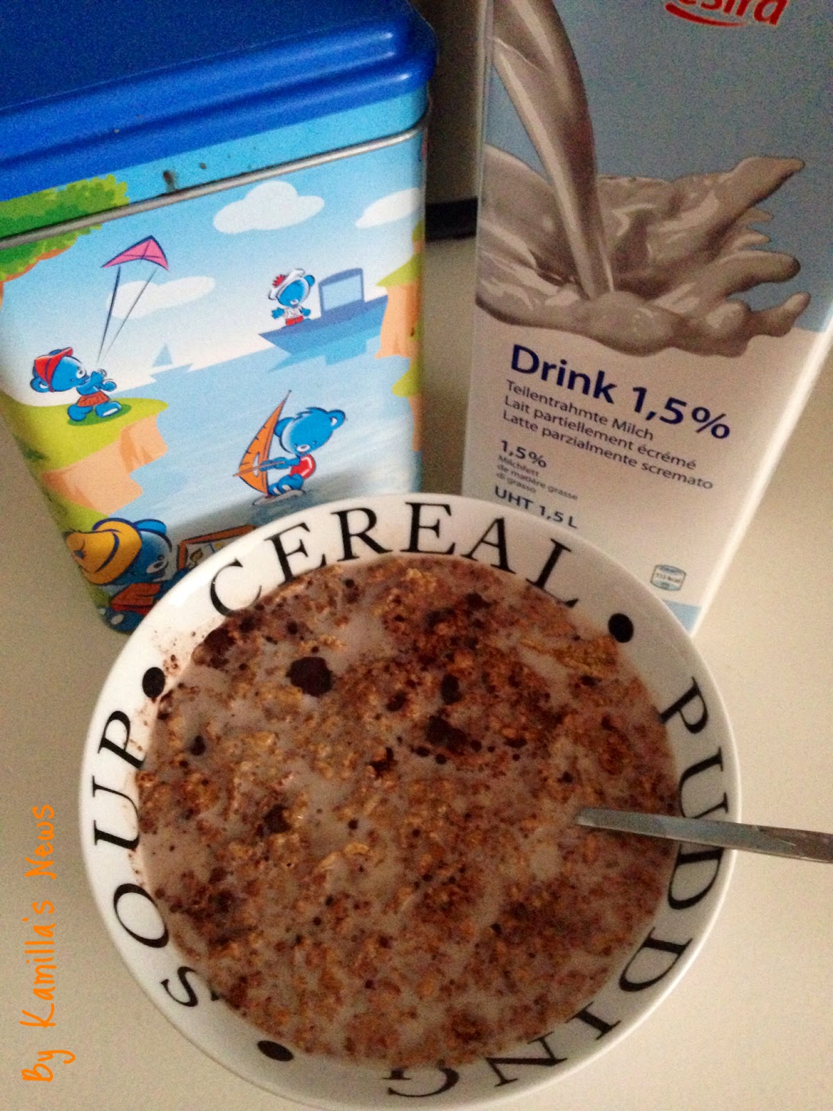 Als mein Bruder zu Besuch war hatte er die Fitness Cornflakes entdeckt und wollte gleich ein Müsli machen. Ich habe Ihm gleich eins von den Muster verteilt. Auch er ist so einer wie wir am liebsten mit Milch und Schokolade.