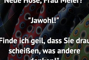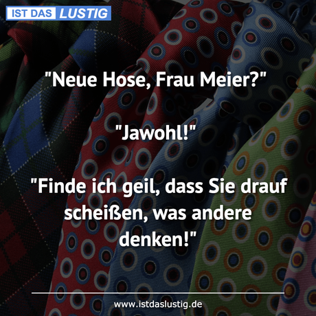 Auf Facebook teilen Vorige Folgende "Neue Hose, Frau Meier?" "Jawohl!" "Finde ich... Autor des Artikels : istdaslustig Zum Original-Artikel "Neue Hose, Frau Meier?" "Jawohl!" "Finde ich geil, dass Sie drauf scheißen, was andere denken!" Hier geht es zum Artikel Mehr Lustiges auf www.istdaslustig.de Auf Facebook teilen Vorige Folgende Das könnte Ihnen gefallen Mehr