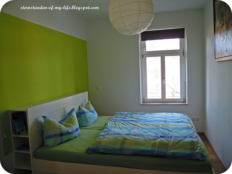 Wir haben uns dann vor dem Streichen für einen dicken grünen "Balken" entschieden.Und so sieht unser Schlafzimmer heute aus: