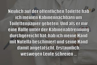 Neulich auf der öffentlichen Toilette hab ich meinen Kabinennachbarn um Toilettenpapier gebeten. Und als er mir eine Rolle unter der Kabinenabtrennung durchgereicht hat, hab ich meine Hand mit Nutella beschmiert und seine Hand damit angetatscht. Erstaunlich, weswegen Leute schreien ...