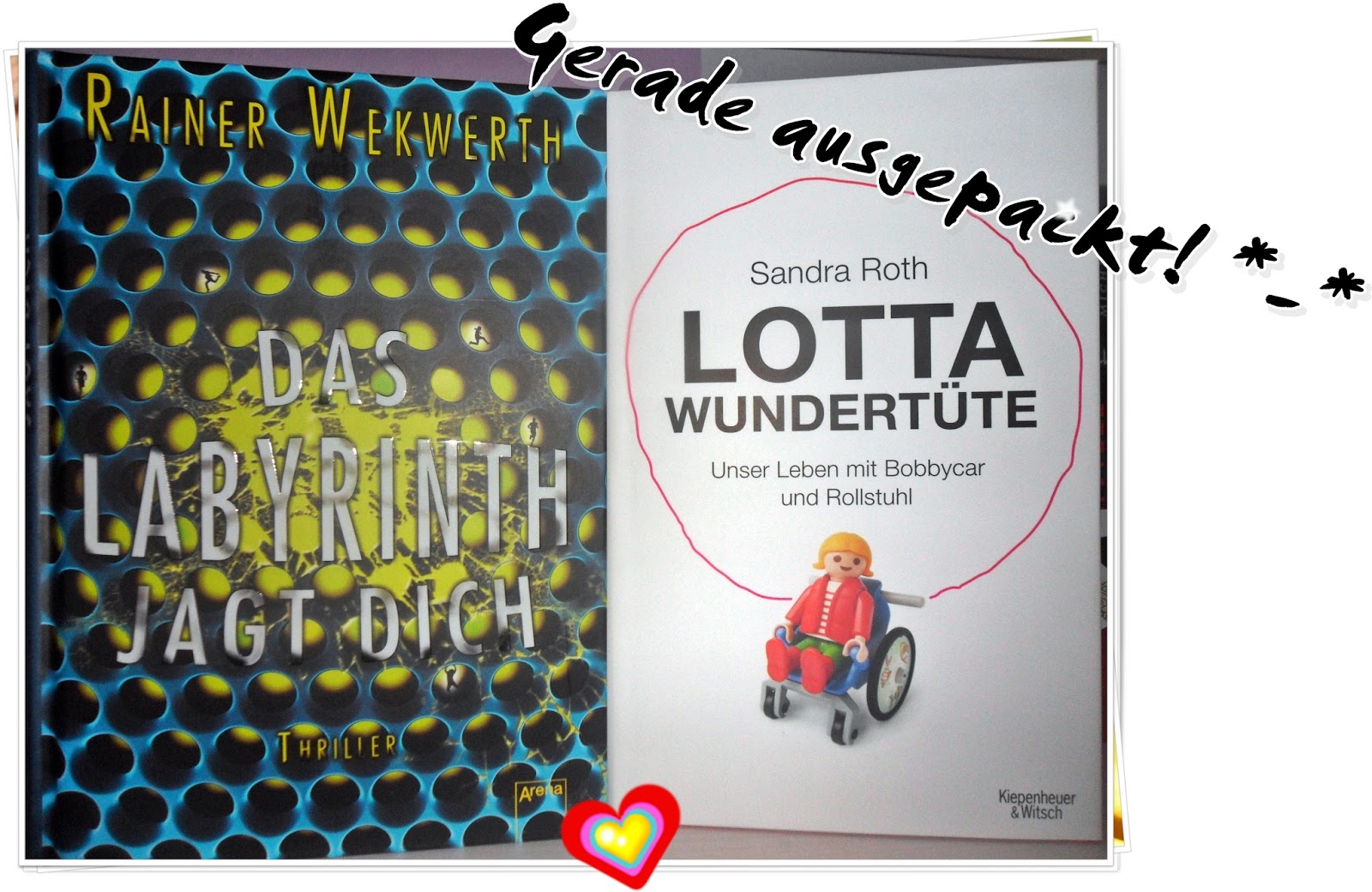 Und zu guter Letzt kamen heute bei mir der 2. Teil der "Das Labyrinth"- Trilogie an, den ich jetzt erst einmal lesen möchte. Dafür wird übrigens kurzzeitig "Arkadien brennt" unterbrochen, da Rezensionsexemplare immer vorgehen. ^^ Außerdem wollte ich nach den vielen guten Meinungen zu "Lotta Wundertüte" auch die Geschichte von Lotta lesen. Es geht in die Richtung Sachbuch, kann mich aber ganz bestimmt verzaubern und mitreißen.Das kommt auf jeden Fall bald an die Reihe!Das waren meine Neulinge der letzten Wochen. Einige Bücher erwarte ich noch, die bekommt ihr natürlich so schnell wie möglich zu sehen. Ich würde sehr gerne wissen, welche Bücher ihr schon kennt und welche ihr mir in der Richtung sonst noch empfehlen mögt oder welche ihr noch lesen möchtet?- Alles in die Kommentare... *-*Alles Liebe und eine schöne Woche,