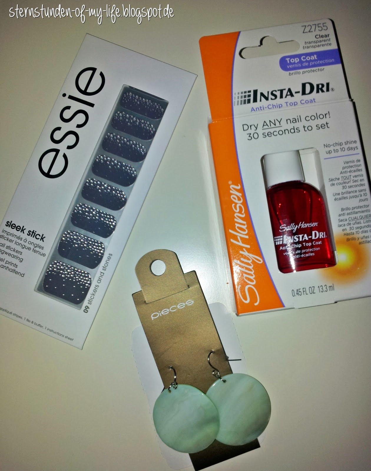Im Müller fand ich (bzw. Herr Schatz :-*) dann das letzte Exemplar essie Nagelsticker in genau dem Design, welches mir nicht aus dem Kopf ging und ich unbedingt haben musste! Außerdem interessierte mich der Insta-Dri Lack von Sally Hansen, da er ja zur Zeit in aller Munde ist. Die türkisen Ohrringe kommen kommende Woche zum Einsatz...
