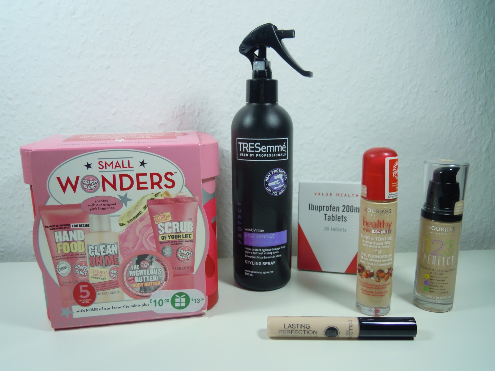 ☆ Small wonders von Soap&Glory; 10 Pfund☆ TRESemmé Hitzeschutz; 4,65 Pfund☆ Ibuprofen 200; 0,40 Pfund☆ Bourjois Healthy Mix Serum☆ Bourjois 1 2 3 Perfekt Foundation☆ Collection 2000 Concealer