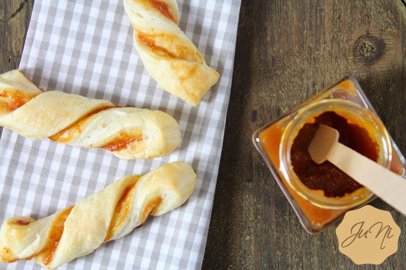 Meist gibt es bei uns den Blätterteig dann einfach mit Nuss-Nougat-Creme oder klein geschnittenen Äpfeln und ein paar Nüssen gefüllt. Doch nun sollte endlich mal etwas anderes, etwas exotischeres her. Und da kam mit der Persimone-Mango-Aufstrich von "mypumpkin's" gerade recht. Eine solche außergewöhnliche Kombi hatte ich nämlich noch nie probiert und dann ist der Aufstrich auch noch mit Limoncello verfeinert - das kann ja nur lecker schmecken.