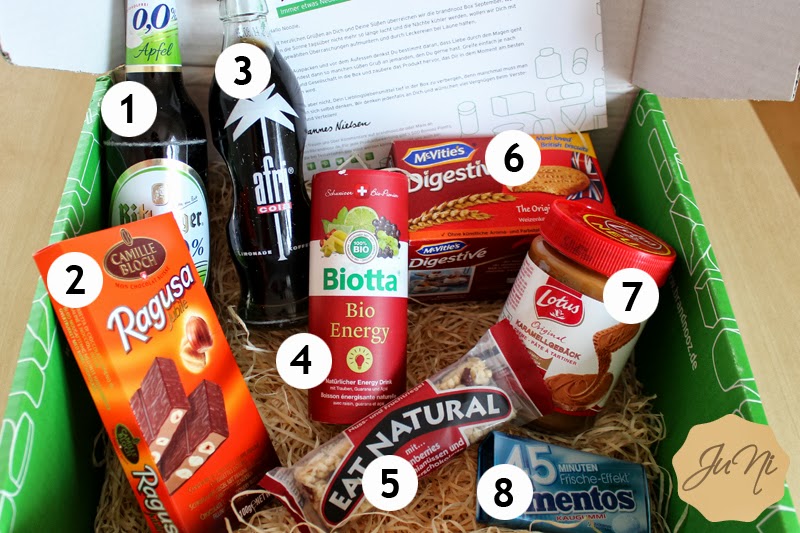Für mich eher was im Sommer, probiert wird es aber trotzdem! :) 2 Ragusa Jubilé | 2,29€ für 100gZartbitterschokolade mit Praliné-Creme und ganzen Haselnüssen - dazu muss ich wohl nicht viel sagen oder? Leeeeecker! Gibt's auch noch in der Sorte "Noir". 3 afri sugarfree | 1,29€ für 0,2l (zzgl. Pfand)Eigentlich sollte dies zuckerfreie Cola sein, jedoch wurde hier die "normale" Cola eingepackt. Brandnooz hat sofort eine Entschuldigungs-Mail geschickt und der nächsten Box liegt dann die zuckerfreie Cola bei - toller Service! 4 Biotta Bio Energy | 2,70€ für 250mlKoffeinhaltiges Erfrischungsgetränk aus Fruchtsäften, Guarana und Mate-Teeauszügen.