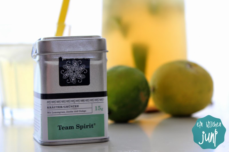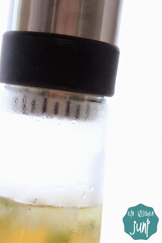 Meine erste Icetea-Kreation "Birne-Mandel-Limette" war übrigens total lecker und ich möchte sie euch natürlich nicht vorenthalten. Ich habe in die Karaffe etwas Birnensaft und Mandelsirup gegeben. Dann habe ich eine Limette in Scheiben geschnitten und dazu gegeben. Mit einem langstieligen Löffel habe ich die Mischung etwas vermischt bzw. die Limetten leicht zerquetscht. Die Karaffe wurde jetzt zu 2/3 mit Eiswürfeln aufgefüllt und der Deckel aufgeschraubt. In den Deckel-Filter habe ich 2 TL losen Tee (in dem Fall "Team Spirit") geben und mit heißem Wasser übergossen. Nach der Ziehzeit habe ich dann den den "on the rocks"-Effekt gestartet und mein Eistee war fertig.