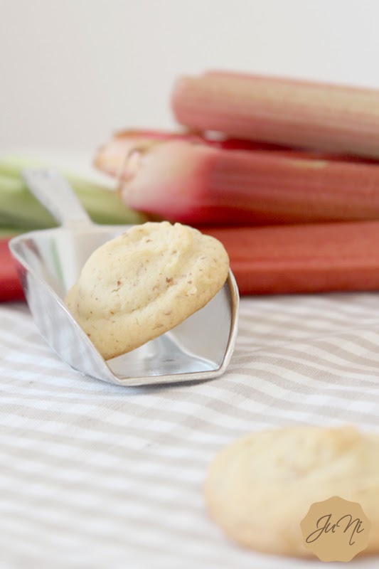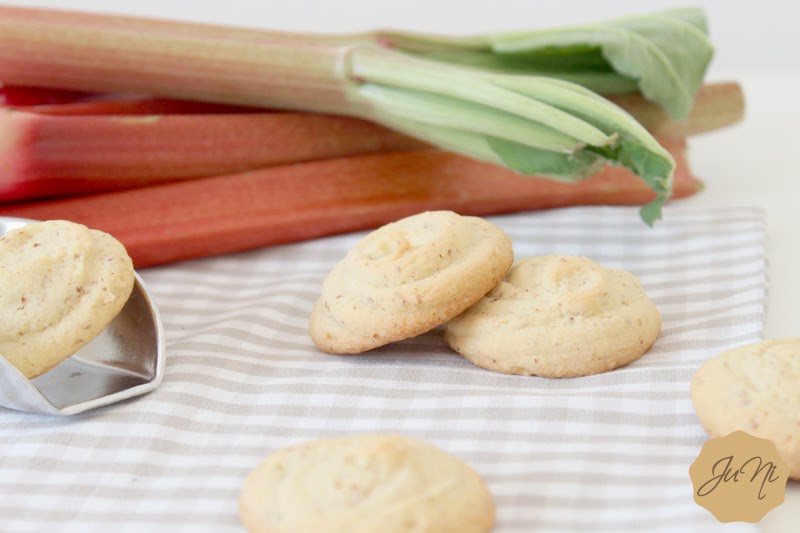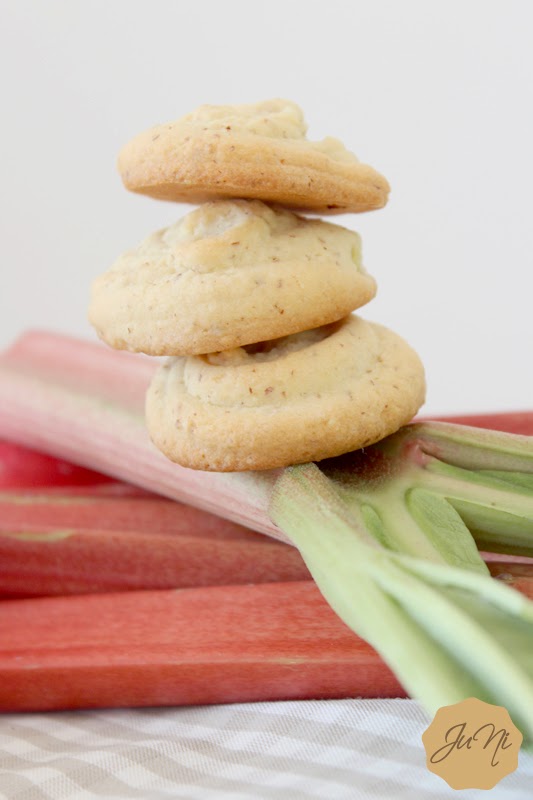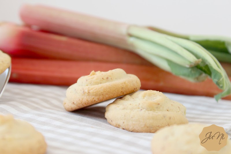 Zubereitung:Butter und Puderzucker schaumig schlagen.Rhabarber waschen, schälen und in kleine Stücke schneiden. Ei und Vanille zu der Butter-Zucker-Mischung geben und so lange rühren bis ein weicher Teig entstanden ist. Mehl und Mandeln vermischen und zum Teig geben, den Eierlikör ebenso.Zum Schluss die kleinen Rhabarberwürfel unterheben. Die Teigmasse nun in einen Spritzbeutel geben und kleine Kekse (ca. 3 - 4cm Durchmesser) auf ein mit Backpapier belegtes Backblech legen.Im vorgeheizten Backofen bei 180°C rund 15 Minuten goldbraun backen.Kekse nach dem Backen vom Blech ziehen und auskühlen lassen.