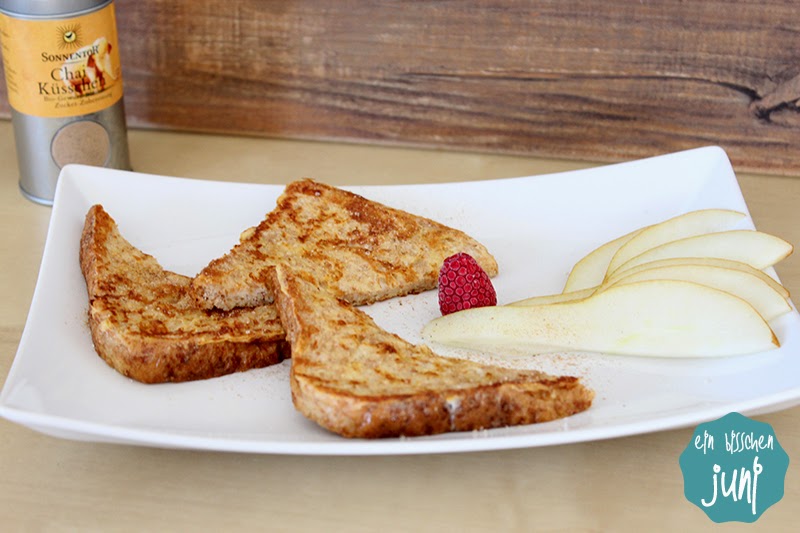 Diese Zuckermischung besteht (neben Rübenzucker) aus Zimt, Kardamom, Ingwer und Piment und macht sich nicht nur auf Milchschaum gut, sondern auch auf allerlei Süßspeisen (Milchreis, Quark, Grießbrei, ...) und natürlich auf meinem leckeren Frühstück: FRENCH TOAST!Wenn ich morgens Zeit für ein gemütliches Frühstück habe, dann liebe ich es einfach.Die Toasts sind schnell gemacht:Zutaten für 3 Toast:1 Eietwas Milch (sehr lecker auch Mandel- oder Kokosmilch)3 Scheinen Vollkorntoastetwas Öl für die PfanneChai-Küsschen (oder einfach Zimt, Vanille, ... nach Belieben)Zubereitung:Ei aufschlagen und mit einem kräftigen Schuss Milch verrühren. Das geht am besten mit einer Gabel in einem Suppenteller. Danach die Toastscheiben in die Ei-Milch-Mischung geben und etwas ziehen lassen. Ein wenig Öl in einer Pfanne erhitzen und die Toastscheiben darin goldbraun ausbacken.