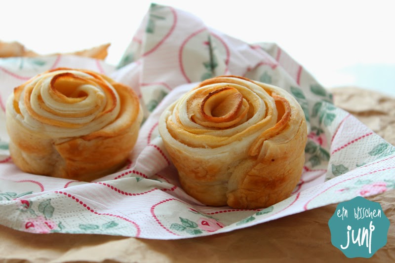 Schnell habe ich mich für "Apfelrosen" entschieden, denn die Zubereitung war denkbar einfach und trotzdem machen diese kleinen Schmuckstücke ordentlich was her. Zutaten für ca. 8 Apfelrosen:2 Rollen Blätterteig2-3 große Äpfelbrauner ZuckerZimt Zubereitung:Den Blätterteig ausrollen und längs in 4 Streifen teilen. Mit dem zweiten Blätterteig ebenso verfahren. Blätterteig mit etwas braunem Zucker und Zimt bestreuen. Die Äpfel waschen und das Kerngehäuse entfernen. Nun in dünne Scheiben schneiden. Die Apfelspalten nun in etwas Wasser weich dünsten (damit sie sich besser rollen lassen, das dauert nur ca. 5 - 10 Minuten) und etwas auskühlen lassen.Die Apfelspalten nun auf die einzelnen Blätterteigstreifen legen und aufrollen. Achtet darauf, dass ihr die Apfelspalten ziemlich weit oben an den Rand legt, damit diese leicht überstehen. Die Apfelrosen dann in ein gefettetes Muffinblech setzen.Im vorgeheizten Backofen bei rund 180°C 20-25 Minuten backen.